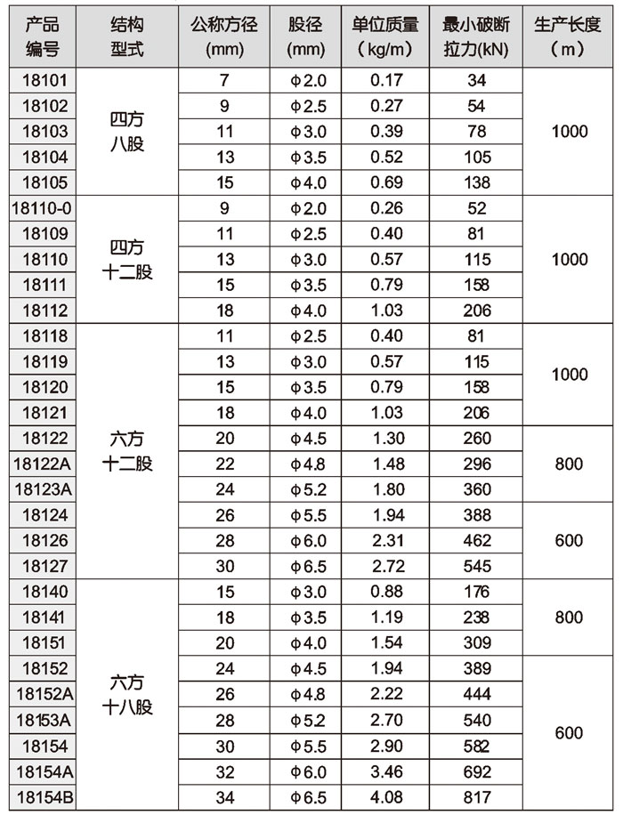 • 本表規(guī)格破斷力為采用1960MPa強(qiáng)度等級的鍍鋅鋼絲繩單股編織的,如需其他強(qiáng)度等級的鋼絲繩,請洽本公司;