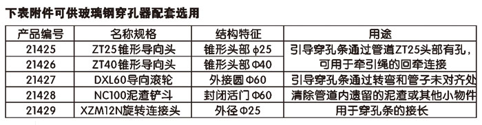 組成:玻璃鋼穿孔器由穿孔條和小車組成,穿孔條兩頭各有M12螺紋連接的尼龍導(dǎo)向頭和牽引環(huán),穿孔條的標(biāo)準(zhǔn)長度為100m。