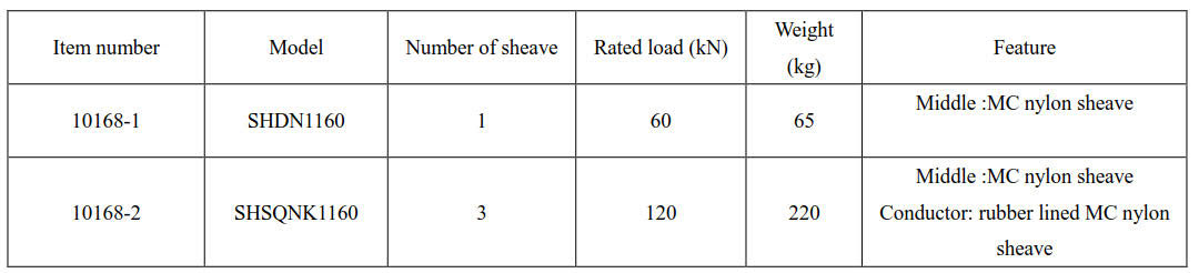 Dimension of block for conductor ( outside diameter× root diameter × sheave width) Φ1160×Φ1000×150(mm).